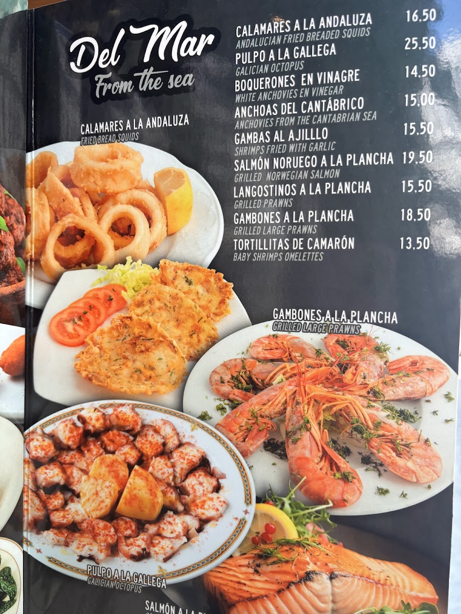 The food options include staple dishes such as paellas—both mixed and seafood varieties—Galician octopus, and seafood tapas. Other notable items include traditional stews like garbanzos con callos and fabada asturiana, as well as meats such as rabo de toro and lomo with mustard and honey sauce. Lighter options such as salads with grilled prawns and vegetables like pimientos de padrón are also available.