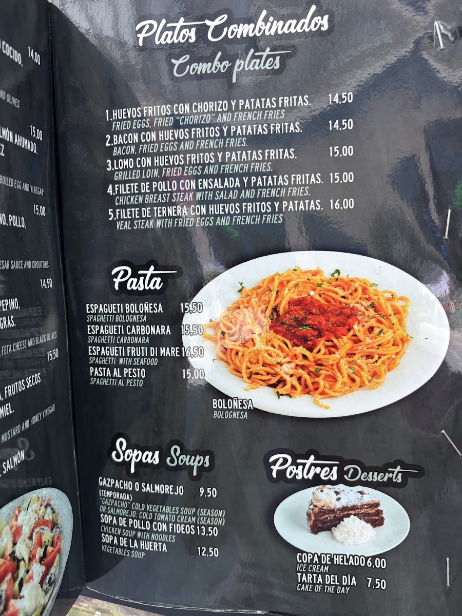In addition to savory dishes, the menu features coffee offerings including café con leche and café bonbon, complementing meals or suitable for coffee breaks.